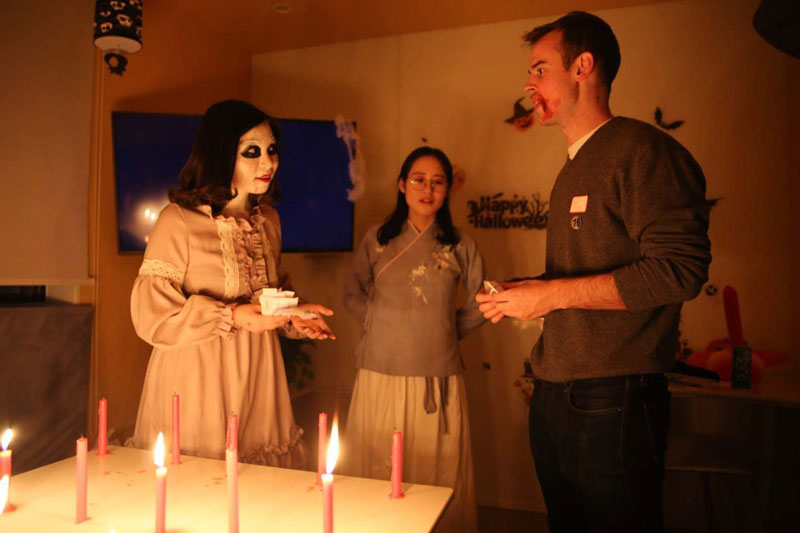 每个老师都有属于自己的一间教室,并且精心策划了和万圣节有关的主题活动或者游戏。例如精心布置的鬼屋电影院,播放带有恐怖节日氛围的中文电影,让同学们在感受小心肝颤抖的同时也能学到中文,吸引了众多学生进去观看,时不时传来的阵阵惊叫声让一些胆小的同学驻足门外,却又欲罢不能。